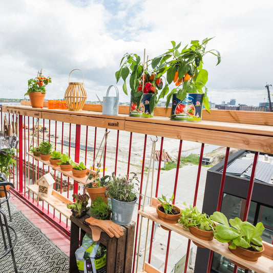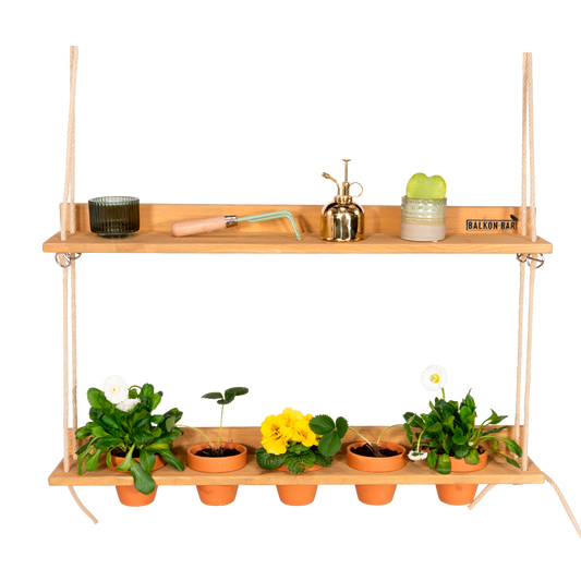 Das Must-have für alle Pflanzenliebhaber: der Hängende Garten von Balkonbar! Balkonbars hängender Garten kann unterhalb deiner Balkonbar, an einer Wand oder sogar an deinem Treppengitter angebracht werden. Der Hängende Garten beinhaltet 5 runde Löcher mit einem Durchmesser von 10 cm, in welche du deine Blumentöpfe stecken kannst. Ideal um einen kleinen Gemüsegarten mit Pflanzen, Kräutern und bunten Blumen zu kreieren.