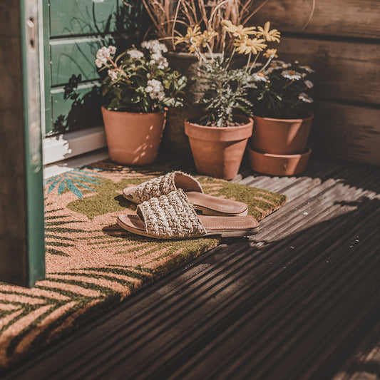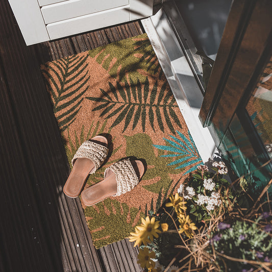 Die Dschungel Fußmatte ist aus Kokosfasern hergestellt. Hartnäckiger Schmutz kann Dank der Kokosfasern leicht entfernt werden. Ausgestattet mit dem charakteristischen “Urban Dschungel” Design, passt die 100% natürliche Fußmatte perfekt auf jeden Balkon.